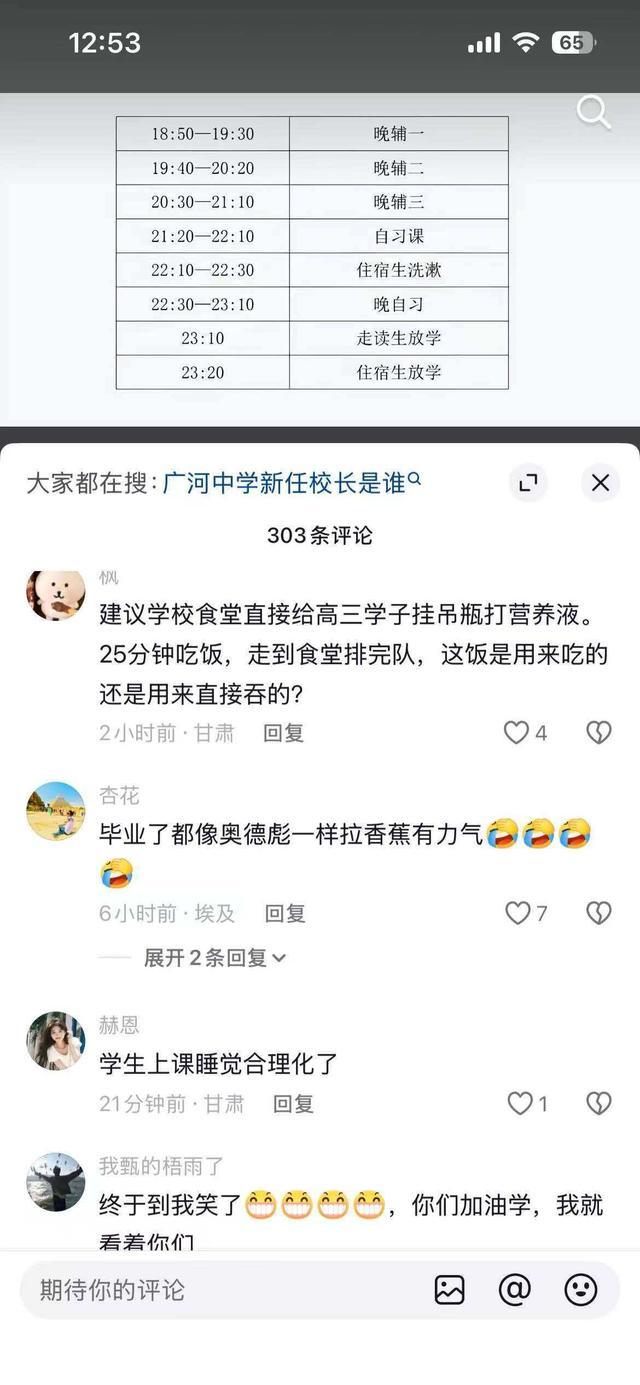 而该“逆天”作息表引发了广大网友的调侃谴责和对学子们身体健康的担忧。“建议学校食堂直接给高三学子挂吊瓶打营养液。25分钟吃饭,走到食堂排完队,这饭是用来吃的还是用来直接吞的?”有网友如此表达不满。“学生的身心健康尤为重要,不要太给学生过多压力,倒反天罡无效用功!”另一名网友如是说。还有网友用更为理性和专业的角度分析了这一作息安排的害处:严重透支健康:睡眠时间不足7小时,远超教育部规定,长期会导致身心俱疲;违背教育规律:过度强调“时间换分数”,忽视了学习效率、自主能力和全面发展;加剧教育内卷:以牺牲学生长远发展为代价,换取短期成绩,是极不可取的管理方式。