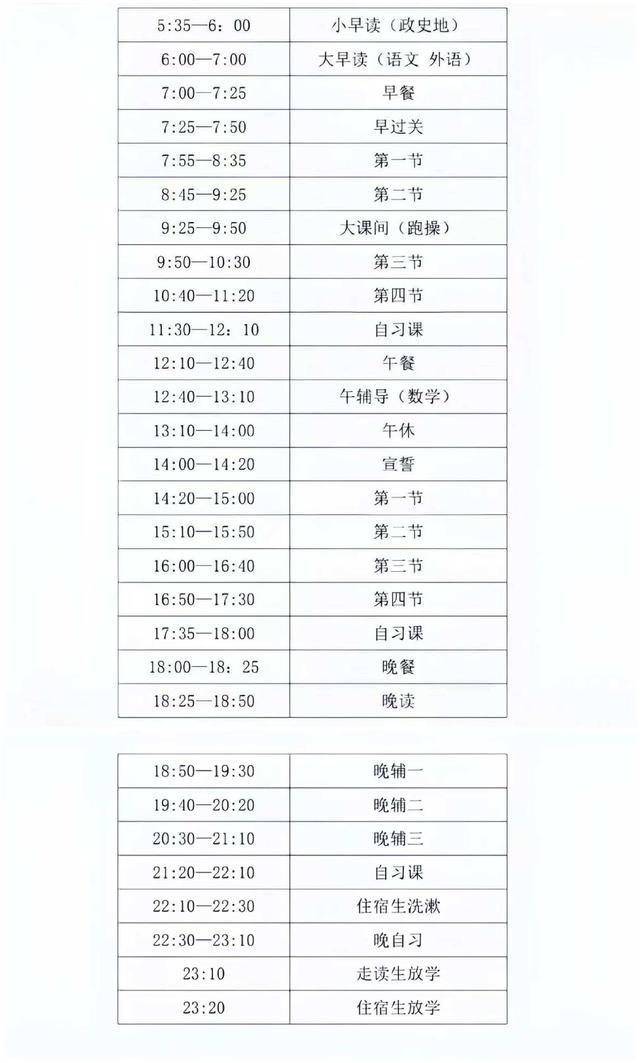 网传作息表截图显示,从早上5点35就要进行自习背书,早餐25分钟午餐30分钟晚餐25分钟,午休30分钟,宣誓20分钟,其余时间基本都在上课,22点住校生20分后洗漱完毕还要继续上晚自习至23点20,走读生上课到23点10分。